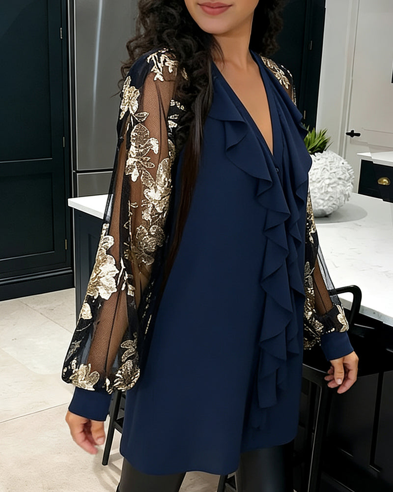Lekka, czarna tunika z delikatnymi falbanami z przodu i półprzezroczystymi rękawami ozdobionymi złotym kwiatowym haftem. Swobodny krój pięknie układa się na sylwetce, a dekolt w kształcie litery V dodaje całości eleganckiego charakteru. Idealna zarówno na wieczorne wyjście, jak i na stylizację na co dzień.